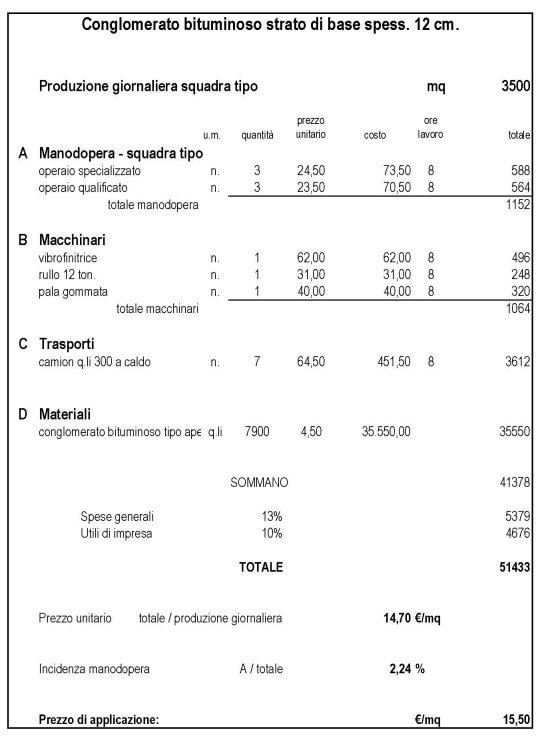Analisi prezzo per opere stradali: Formazione di strato base di conglomerato bituminoso dello spessore di 12 centimetri. |