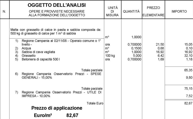 Analisi prezzo per la realizzazione di malta in grassello di calce e sabbia