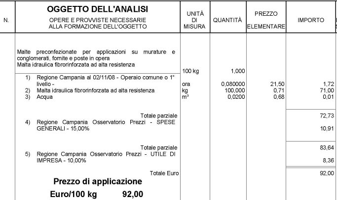 Analisi prezzo per la realizzazione di malta idraulica fibrorinforzata