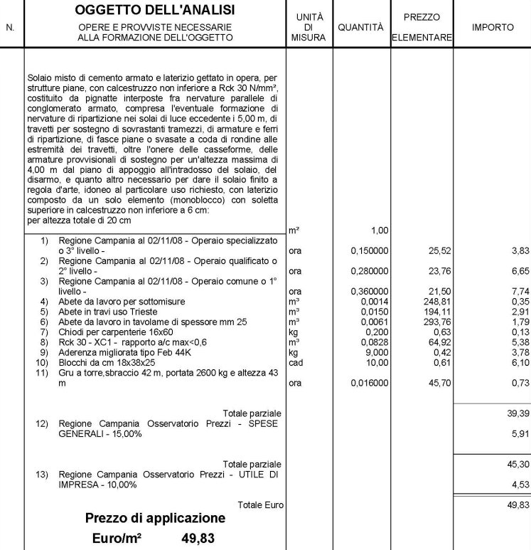 ANALISI PREZZO PER SOLAI LATEROCEMENTO GETTATO IN OPERA H 20 CM