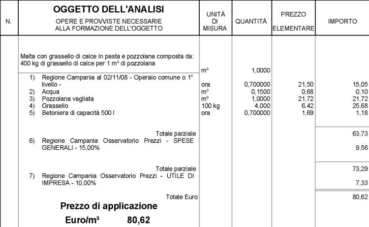 Analisi prezzo per la realizzazione di malta in grassello di calce e pozzolana