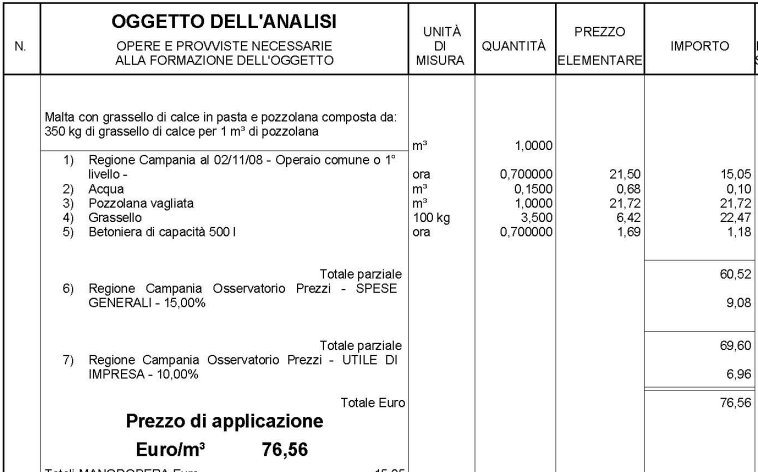 Analisi prezzo per la realizzazione di malta in grassello di calce e pozzolana