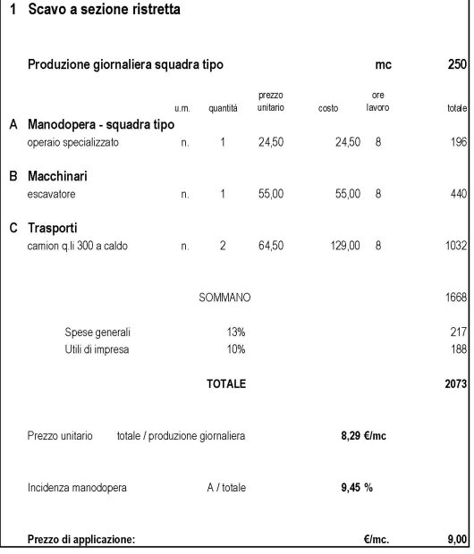 ANALISI DEI PREZZI PER SCAVO A SEZIONE RISTRETTA ESEGUITO CON MEZZI MECCANICI