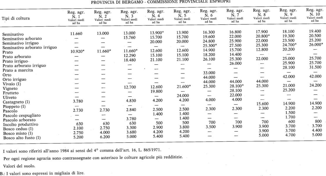 Valori Agricoli Medi della Provincia Bergamo - Anno 1985
