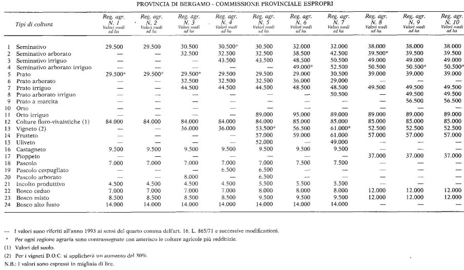 Valori Agricoli Medi della Provincia Bergamo - Anno 1994