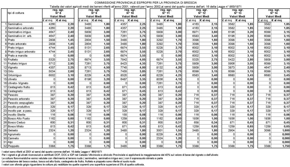 Valori Agricoli Medi della Provincia Brescia - Anno 2002