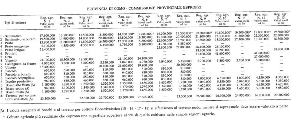 V.A.M. (Valori Agricoli Medi) Validi per la provincia di COMO nell'ANNO 1985