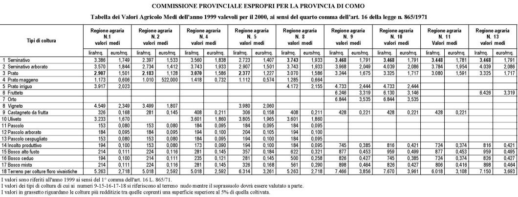 V.A.M. (Valori Agricoli Medi) Validi per la provincia di COMO nell'ANNO 2000