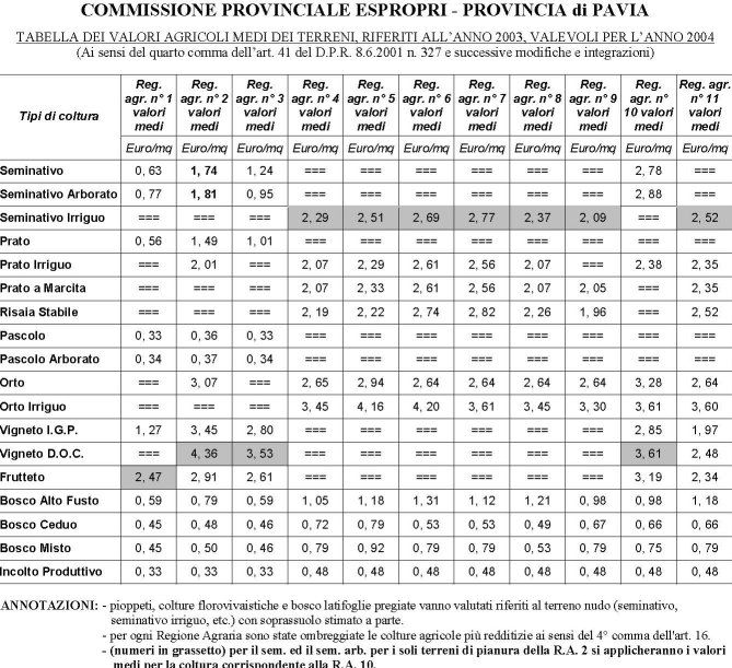 II Valore agricolo medio è determinato ogni anno, entro il 31 gennaio, dalla Commissione Provinciale Espropri nell'ambito delle singole regioni agrarie, con riferimento ai valori dei terreni considerati liberi da vincoli di contratti agrari, secondo i tipi di coltura effettivamente praticati, e rilevati nell'anno solare precedente.I Valori sono espressi in Euro per ettaro.