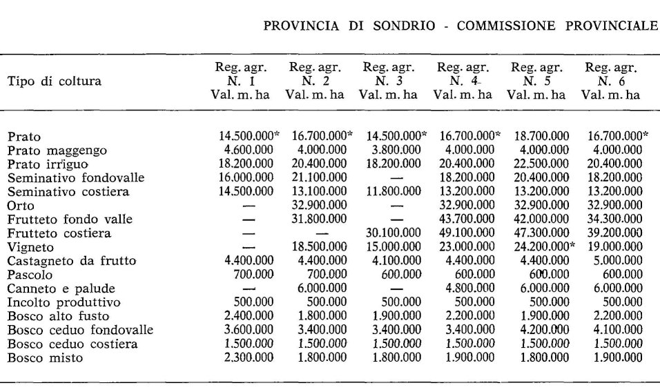 Valori Agricoli Medi della Provincia Sondrio - Anno 1982