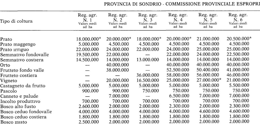 Valori Agricoli Medi della Provincia Sondrio - Anno 1984
