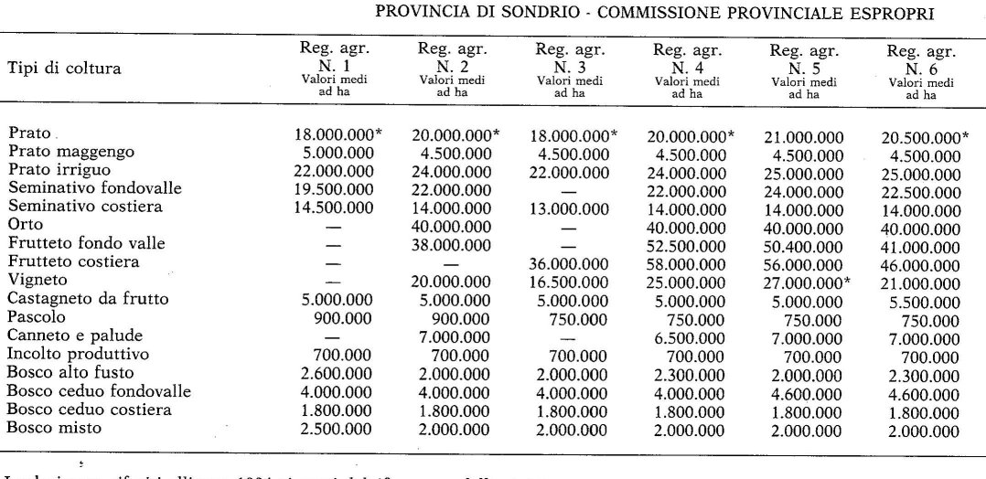 Valori Agricoli Medi della Provincia Sondrio - Anno 1985