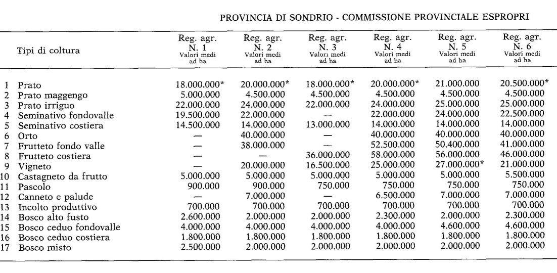 Valori Agricoli Medi della Provincia Sondrio - Anno 1986