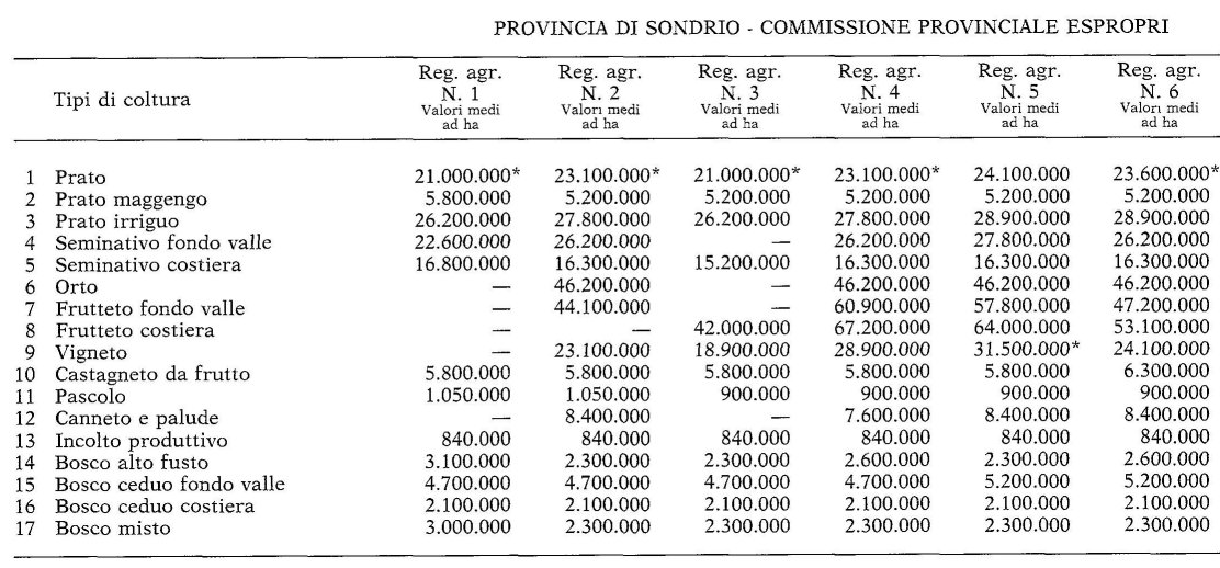 Valori Agricoli Medi della Provincia Sondrio - Anno 1989