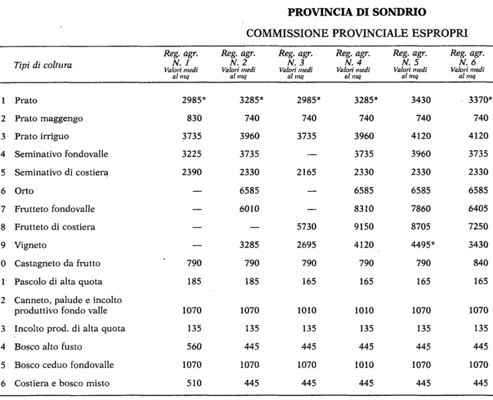 Valori Agricoli Medi della Provincia Sondrio - Anno 1996