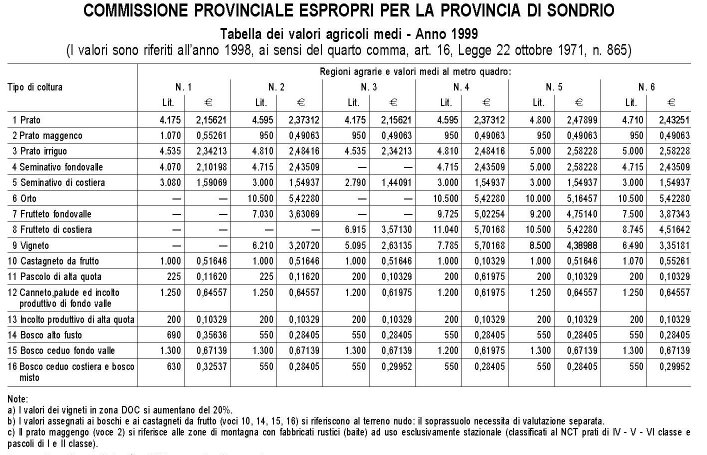 Valori Agricoli Medi della Provincia Sondrio - Anno 1999