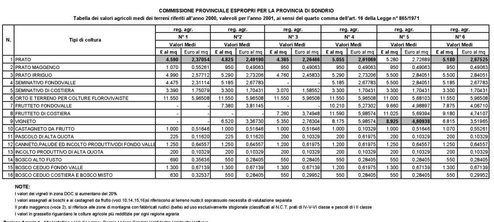 Valori Agricoli Medi della Provincia Sondrio - Anno 2001