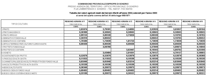 Valori Agricoli Medi della Provincia Sondrio - Anno 2003