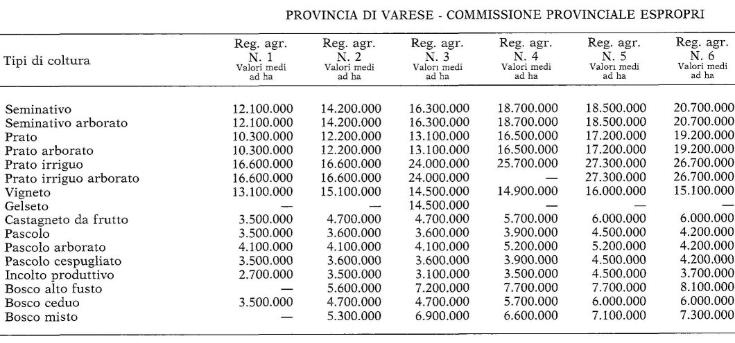 Valori Agricoli Medi della Provincia Varese - Anno 1989