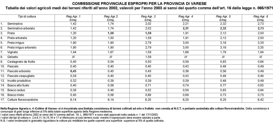 Valori Agricoli Medi della Provincia Varese - Anno 2003
