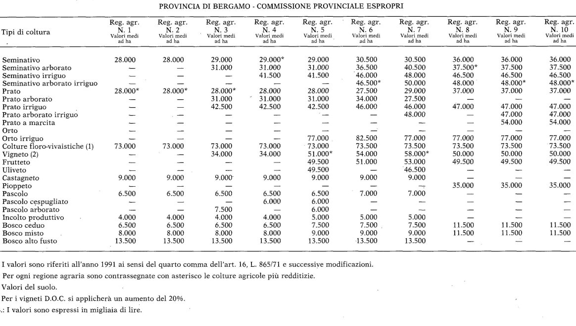 II Valore agricolo medio è determinato ogni anno, entro il 31 gennaio, dalla Commissione Provinciale Espropri nell'ambito delle singole regioni agrarie, con riferimento ai valori dei terreni considerati liberi da vincoli di contratti agrari, secondo i tipi di coltura effettivamente praticati, e rilevati nell'anno solare precedente.I Valori sono espressi in Euro per ettaro.