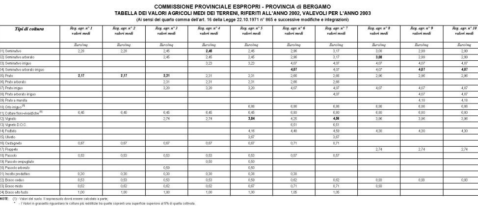Valori Agricoli Medi della Provincia Bergamo - Anno 2003
