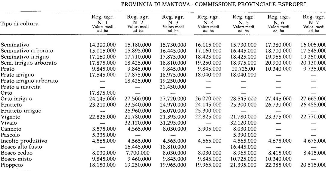 Valori Agricoli Medi della Provincia Mantova - Anno 1984