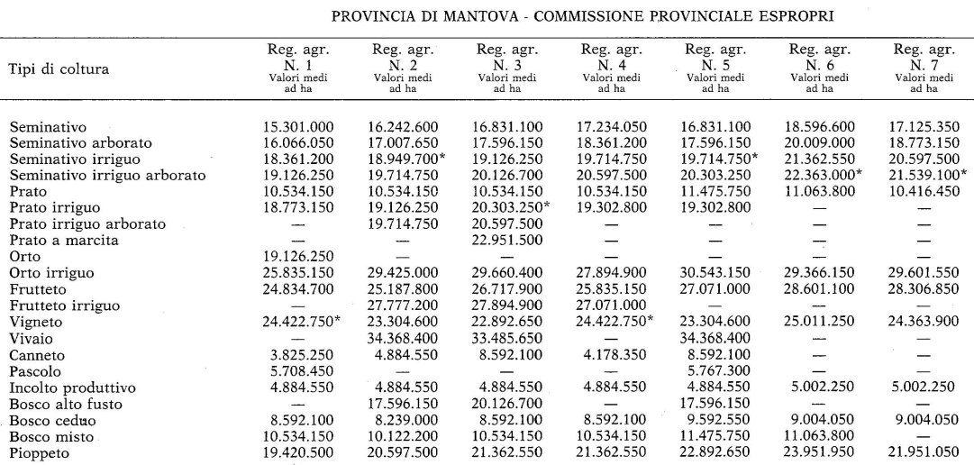 II Valore agricolo medio è determinato ogni anno, entro il 31 gennaio, dalla Commissione Provinciale Espropri nell'ambito delle singole regioni agrarie, con riferimento ai valori dei terreni considerati liberi da vincoli di contratti agrari, secondo i tipi di coltura effettivamente praticati, e rilevati nell'anno solare precedente.I Valori sono espressi in Euro per ettaro.