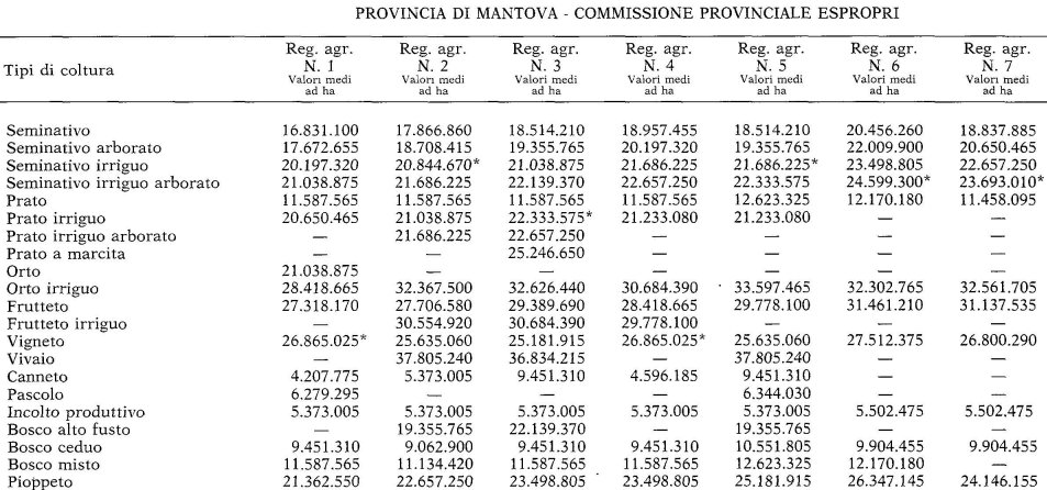 Valori Agricoli Medi della Provincia Mantova - Anno 1986