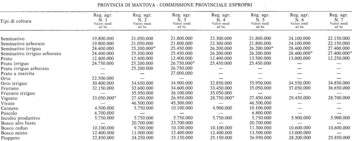 II Valore agricolo medio è determinato ogni anno, entro il 31 gennaio, dalla Commissione Provinciale Espropri nell'ambito delle singole regioni agrarie, con riferimento ai valori dei terreni considerati liberi da vincoli di contratti agrari, secondo i tipi di coltura effettivamente praticati, e rilevati nell'anno solare precedente.I Valori sono espressi in Euro per ettaro.