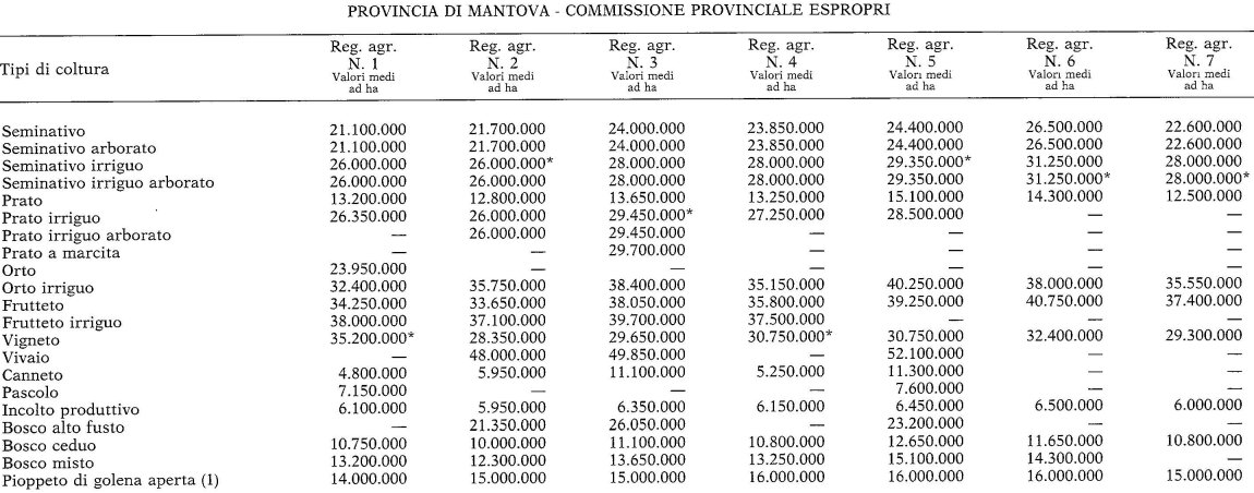 Valori Agricoli Medi della Provincia Mantova - Anno 1989