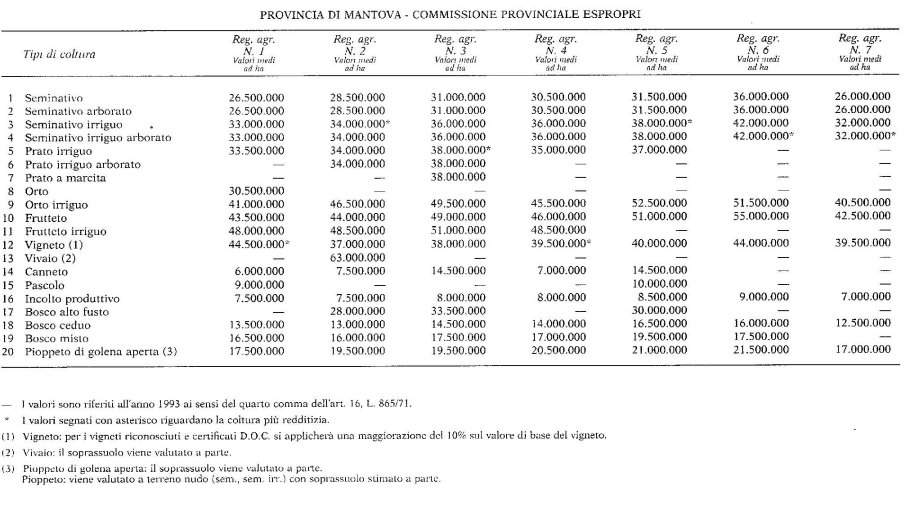 II Valore agricolo medio è determinato ogni anno, entro il 31 gennaio, dalla Commissione Provinciale Espropri nell'ambito delle singole regioni agrarie, con riferimento ai valori dei terreni considerati liberi da vincoli di contratti agrari, secondo i tipi di coltura effettivamente praticati, e rilevati nell'anno solare precedente.I Valori sono espressi in Euro per ettaro.