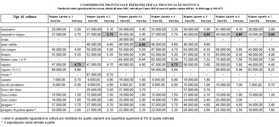 II Valore agricolo medio è determinato ogni anno, entro il 31 gennaio, dalla Commissione Provinciale Espropri nell'ambito delle singole regioni agrarie, con riferimento ai valori dei terreni considerati liberi da vincoli di contratti agrari, secondo i tipi di coltura effettivamente praticati, e rilevati nell'anno solare precedente.I Valori sono espressi in Euro per ettaro.