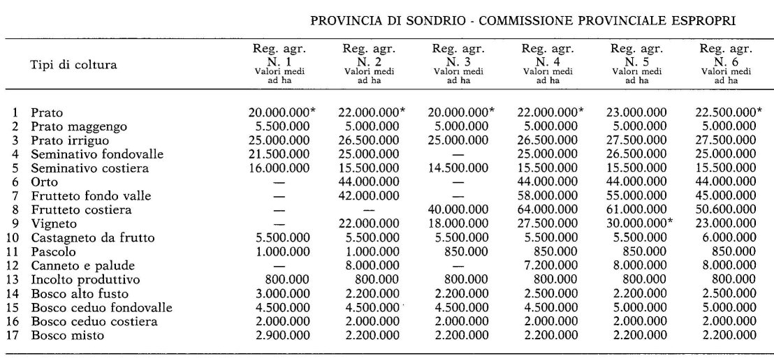 Valori Agricoli Medi della Provincia Sondrio - Anno 1987