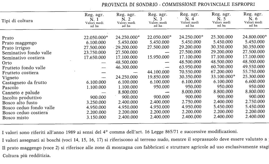 Valori Agricoli Medi della Provincia Sondrio - Anno 1990