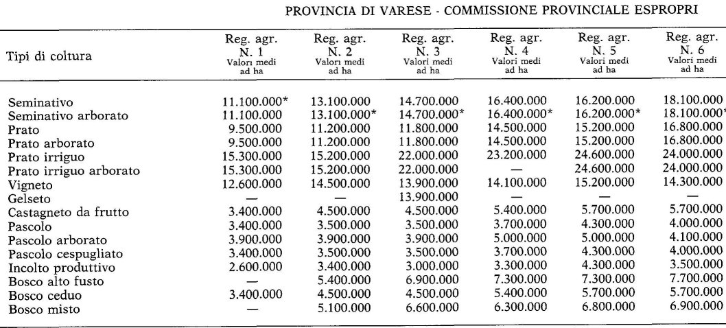 Valori Agricoli Medi della Provincia Varese - Anno 1986