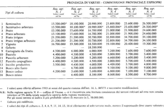 Valori Agricoli Medi della Provincia Varese - Anno 1994