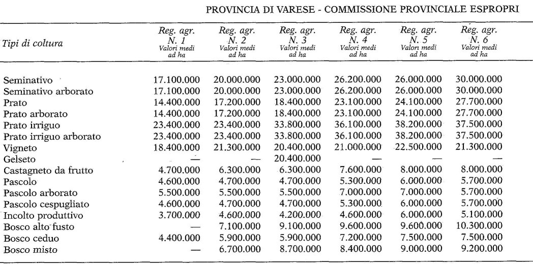 Valori Agricoli Medi della Provincia Varese - Anno 1995