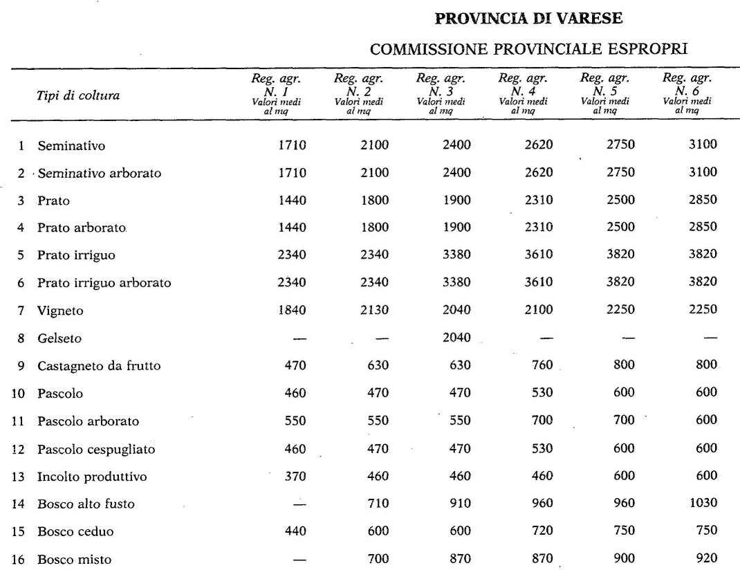 Valori Agricoli Medi della Provincia Varese - Anno 1996