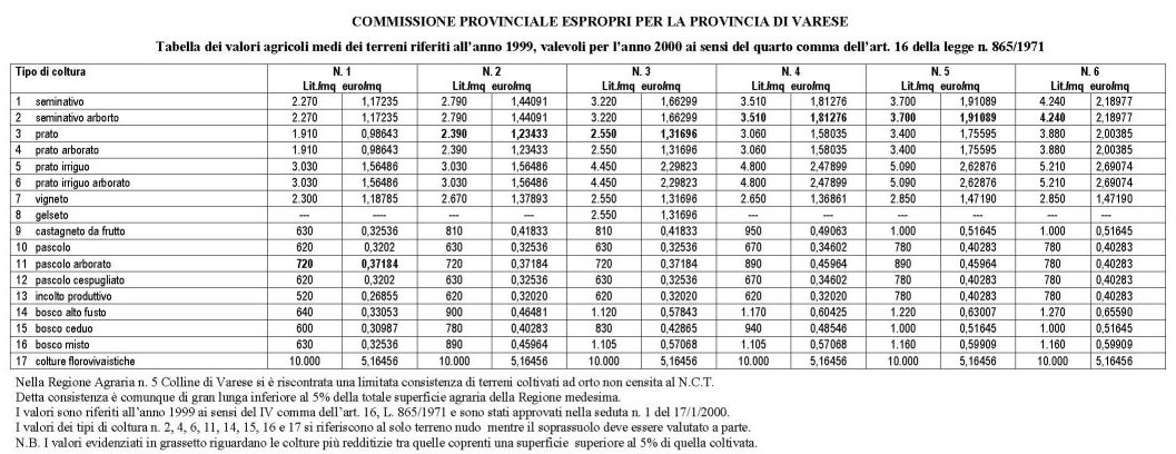 Valori Agricoli Medi della Provincia Varese - Anno 2000