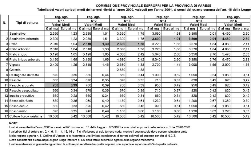 Valori Agricoli Medi della Provincia Varese - Anno 2001
