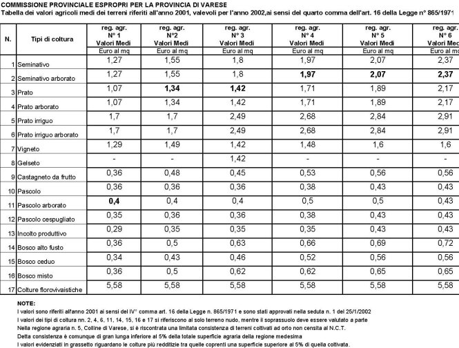 Valori Agricoli Medi della Provincia Varese - Anno 2002